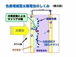 酸化チタンは光触媒で,太陽光によって電子・正孔対を得ることができますが,エネルギーの高い紫外光しか吸収することができないため,色素を使って吸収波長帯域を長波長側に広げ,エネルギー効率を上げる工夫をしています.植物の光合成と似ているので,「光合成型太陽電池」とも呼ばれています.