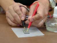 1.まず,テスターでガラス板の透明電極のついた面を確認し,表にします.
