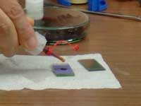 10.いよいよ電池を組み立てます.写真の左手が負極である酸化チタン焼結膜電極,右手が正極であるグラファイト電極です.まず,酸化チタン電極の方に電解質溶液であるヨウ素溶液を一滴垂らします.