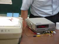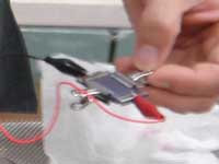 12.光を当てて電圧が発生するか確かめます.教室にオーバーヘッドプロジェクタがあったので,その上に作製した電池を乗せて,電源のON/OFFでどのような変化をするか調べました.実は,教室の蛍光灯の明るさだけでも,100mV程度の電圧が発生します.暗い箱の中に入れてやるとほぼ 0 mV まで電圧が落ちるのが確認できます.オーバーヘッドの光で約400mVの開放電圧を得ることができました.また,短絡電流は約0.5mAでした.