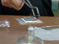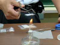5.酸化チタンペーストを塗ったスライドグラスをアルコールランプであぶって,酸化チタンをガラスに焼き付けます(焼結).できれば,この前にドライヤーなどで水分を飛ばしておいた方がよいです.講義では時間がなかったのでその手順は省きました.また,ガラスは温度むらができると割れてしまうので,できれば,写真のように持つのではなく,網か何かに乗せて均一に熱した方がよいです.講義では失敗してガラスを割ってしまいました.(^^;
