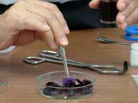 7.十分冷めたら色素で染色します.色素にはハイビスカスのドライフラワーを使います.ドライフラワーを水に浸け,その中に焼結膜を浸します.最低20分は必要で,できれば一晩浸けた方が色素の定着がよいようです.色素は濃い方が光電流を稼ぐことができます.講義では,あらかじめ一晩浸けた焼結膜も使用しました.
