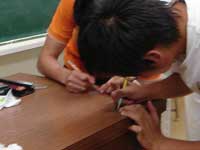 9.次に正極を作ります.透明電極のついたガラスの表面をテスターで確認したあと,その表面にグラファイトの薄膜を作ります.といっても柔らかい鉛筆で電極の表面を塗るだけです.講義では受講している4年生が作ってくれました.