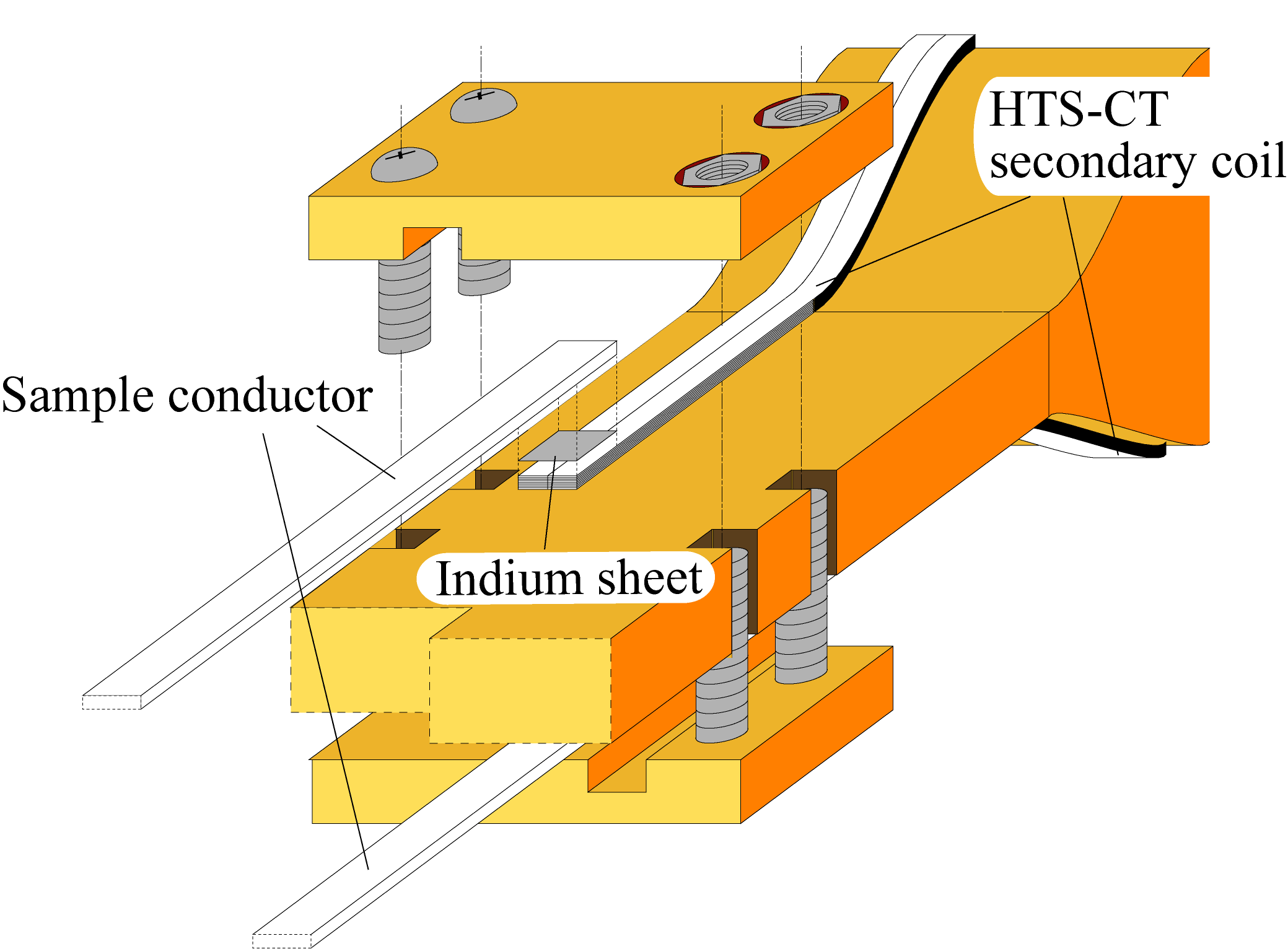 開発した装置は、試料導体に最大約1.5Tの直流磁界を印加でき、また超伝導電流トランスを用いることで、50A程度の小容量電源で1kA級の交流電流を通電することができます。試料導体は電流トランスの2次側巻線に接続しますが、種々の導体の特性評価を行うためには、電流トランスと試料導体との接続方法について検討する必要があります。我々は、ベーク板で試料導体を挟みネジ留めする方法を接続部に採用することで、電流トランスと試料導体とを、簡便で繰り返し低抵抗で接続可能な接続を実現しています。現在この装置を活用し、種々の超伝導大型導体の通電特性の評価を行っています。